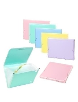 Clasificador de acordeón en tamaño A4, fabricado con polipropileno opaco de alta calidad, y cierre de goma elástica. Contiene etiquetas de colores para etiquetar los distintos departamentos.