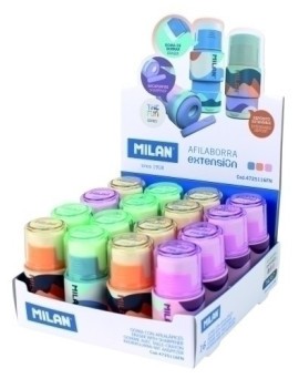 Combinación de goma y sacapuntas. El sacapuntas tiene una cuchilla de seguridad de acero de carbono afilada y resistente, ideal para todo tipo de lápices. Este sistema evita que se pueda separar la hoja del cuerpo del sacapuntas, siendo óptimo para uso escolar. Un diseño con cuerpo cobrizo y tapas en colores surtidos: negro, rosa, lila, verde.