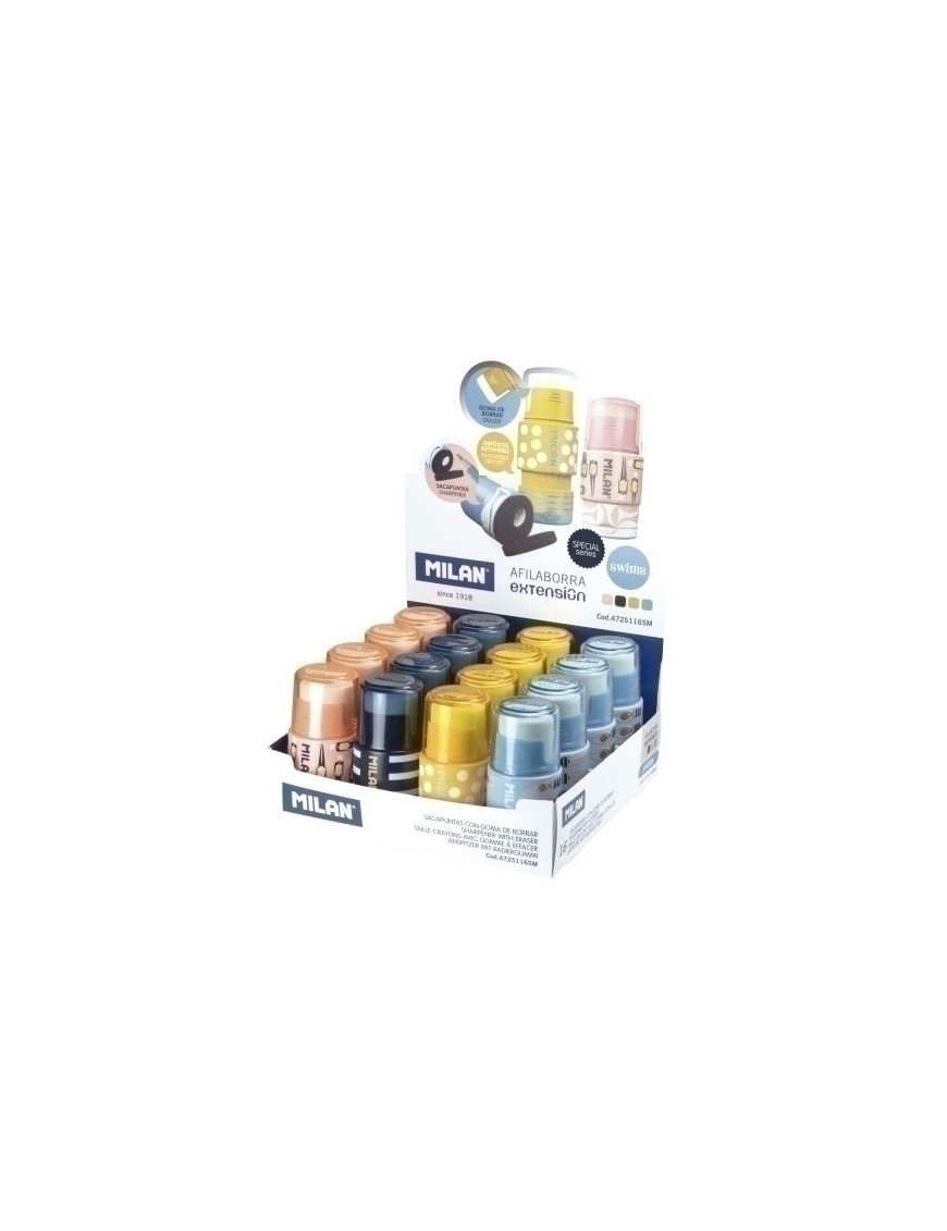 Expositor con goma de borrar + sacapuntas con depósito extensible, serie especial Swims. Goma suave de caucho sintético flexible + sacapuntas con cuchilla de acero afilada y resistente, para afilar todo tipo de lápices (con sistema evita que se pueda separar la hoja del cuerpo del sacapuntas). Contiene 5 unidades de color rosa, 5 azul claro, 3 amarillo y 3 azul marino.