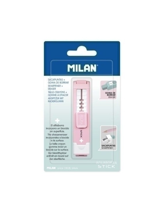 Afilaborra Stick de goma de borrar con sacapuntas, serie Edición + en color. El cuerpo del producto tiene incorporado un biocida (es vidrio de fosfato de plata (CAS 308069-39-8) con efecto antibacteriano). Goma rectangular de caucho sintético "miga de pan" flexible, de gran longitud. El sacapuntas tiene una cuchilla de acero al carbono afilada y resistente, para afilar todo tipo de lápices (sistema evita que se pueda separar la hoja del cuerpo del sacapuntas). Ideal para mejorar la higiene en la escuela, oficina y entornos sanitarios.