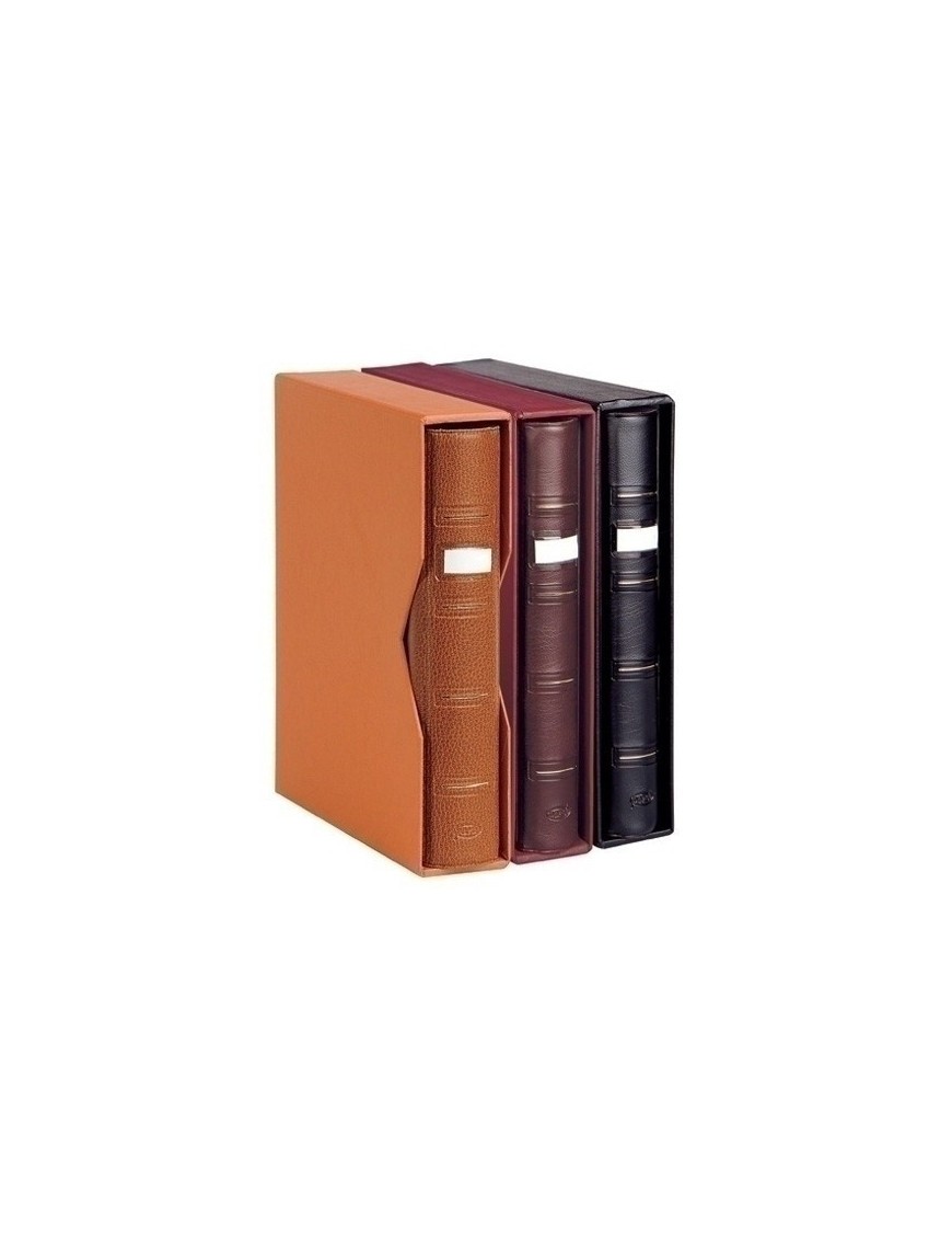 Álbum para sellos, fabricación muy esmerada, con mecanismo automático universal de 15 anillas. Provistos con su correspondiente cajetín protector. Medidas Cajetín-álbum: 295 x 320 x 50 mm.