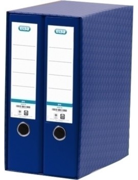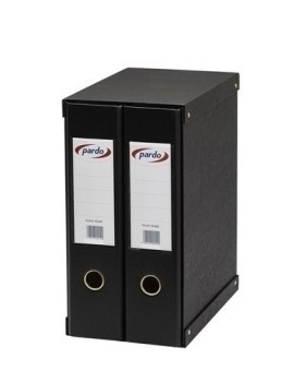 Módulos de 2 archivadores con mecanismo de palanca: archivadores forrados exteriormente con polipropileno e interiormente con papel, con cantoneras metálicas, sistema rado, ollao en aluminio y tarjetero en el lomo. Los cajetines están fabricados en cartón microcanal plastificado.