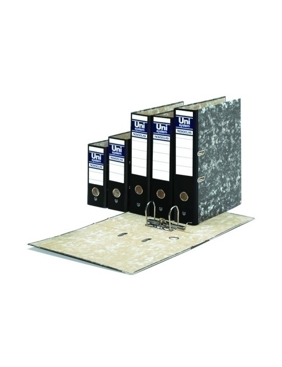 Archivadores fabricados en cartón forrado, con certificado FSC®, interior y exteriormente forrado con papel impreso. Tiene mecanismo de palanca niquelado de 65mm y ollao en el lomo.