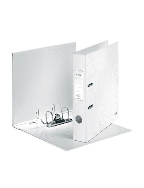 Archivador de palanca con mecanismo de precisión de 180º, etiqueta en el lomo, rado, ollado y tapas de dos colores. Un diseño sofisticado, fabricado en cartón resistente forrado de papel impreso y acabado plastificado, con capacidad para 350 hojas A4 de 80 gramos. Medidas: 318 x 285 x 52 mm.