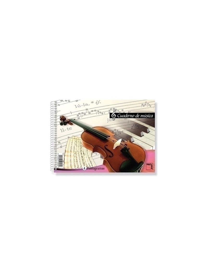 Bloc de música tamaño cuarto apaisado con 4 pentagramas en 20 hojas de papel extra blanco de 80 gramos. Un bloc con cubierta en cartón de 325 gramos impreso a dos tintas, con reverso gris en cartón de 400 gramos y espiral sencillo blanco nylonizado.