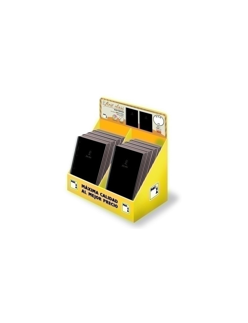 Bloc con tapas forradas en color negro mate y textura Soft. La cubierta cuenta con una impresión metalizada oro o plata en relieve, propia de serie first class (12 unidades por impresión). En su interior cuenta con 120 hojas de papel extra blanco de 100 g/m² microperforado, con precorte, 5 bandas en colores surtidos; rayado 5x5 más greca de color encuadernadas con una espiral de alambre nylonizado con coil-lock. Certificado PEFC. 100% reciclable.