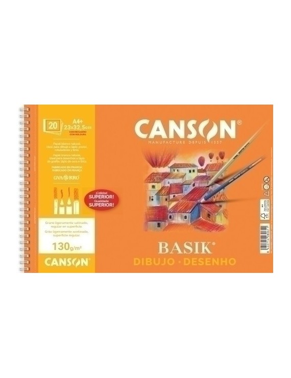 Bloc de dibujo Basik® con espiral microperforado y papel blanco natural, ligeramente satinado, que ofrece dureza y regularidad en su superficie. Un papel de 130 g/m² para dibujo a lápiz y ceras.