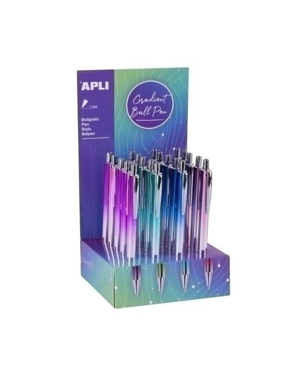 Expositor de bolígrafos metálicos retráctiles con cuerpo efecto UVI, tinta de aceite azul y punta de 1 mm. Bolígrafos resistentes, de secado rápido y larga duración (aprox. 180 metros de escritura). Expositor con 20 bolígrafos: 5 unidades por 4 degradados disponibles.