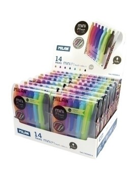 Expositor de bolígrafos metálicos con cristalitos en forma de diamante en la parte superior. Bolígrafos resistentes con tinta de aceite y punta de 1 mm en color azul, para tomar apuntes, subrayar, dibujar, etc. Contiene 5 unidades por color: rosa, turquesa, fucsia, plata y oro.