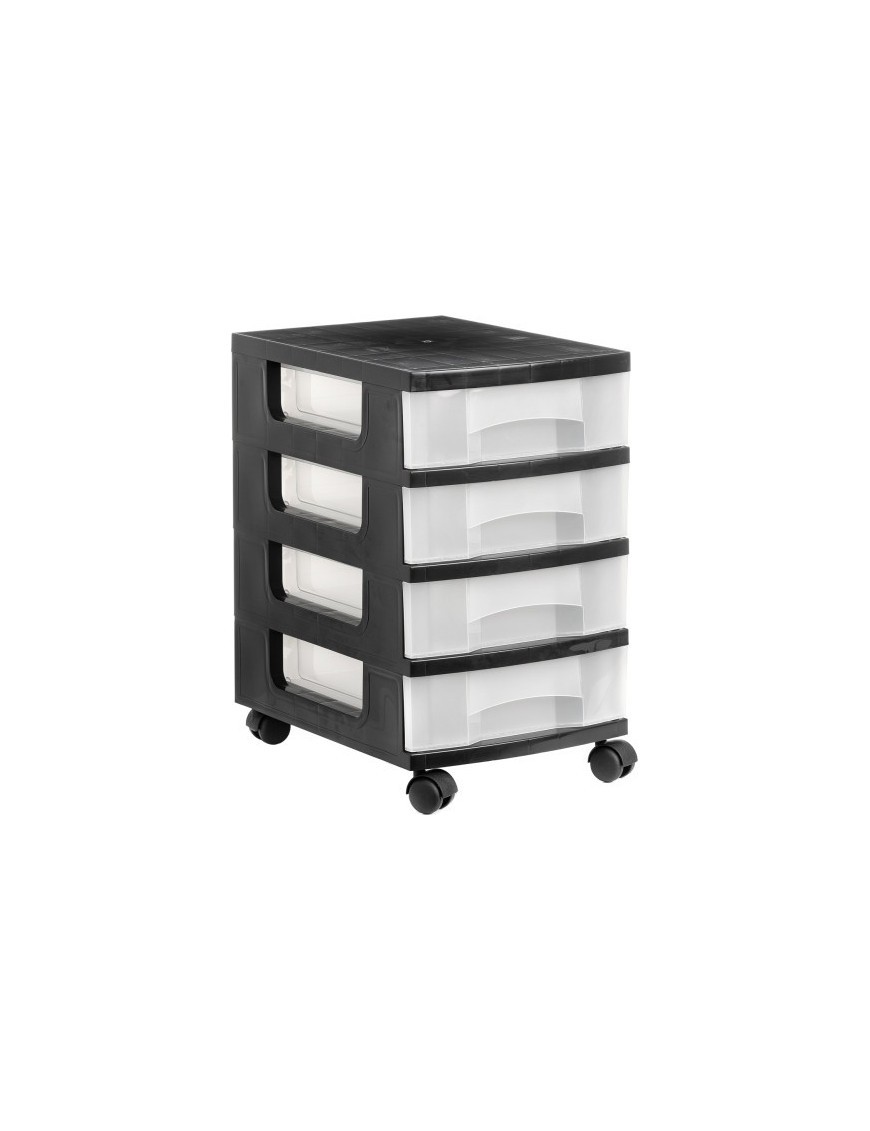 Torre de almacenaje, fabricada en polipropileno copolímero, con ruedas y cuatro cajones en cristal traslúcido, con una capacidad por cajón de 6 litros. El sistema de unión permite crear tu propia torre de almacenaje con los cajones que desees evitando que se separen. Un práctico sistema para llevar la información a donde la necesites. Medidas: 390 x 290 x 480 mm.