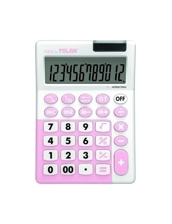 Calculadora de sobremesa de 12 dígitos de la Serie Edición +. El cuerpo de la calculadora y sus teclas tienen incorporado un biocida (vidrio de fosfato de plata (CAS 308069-39-8) con efecto antibacteriano); 4 teclas de memoria; función: raíz cuadrada, gran total y retroceso; tecla de apagado. Alimentación dual: célula solar y pila de 1,5 V. Ideal para mejorar la higiene en la escuela, oficina y entornos sanitarios. Un diseño de nata by Milan. Medidas calculadora: 163 x 116 x 37 mm.