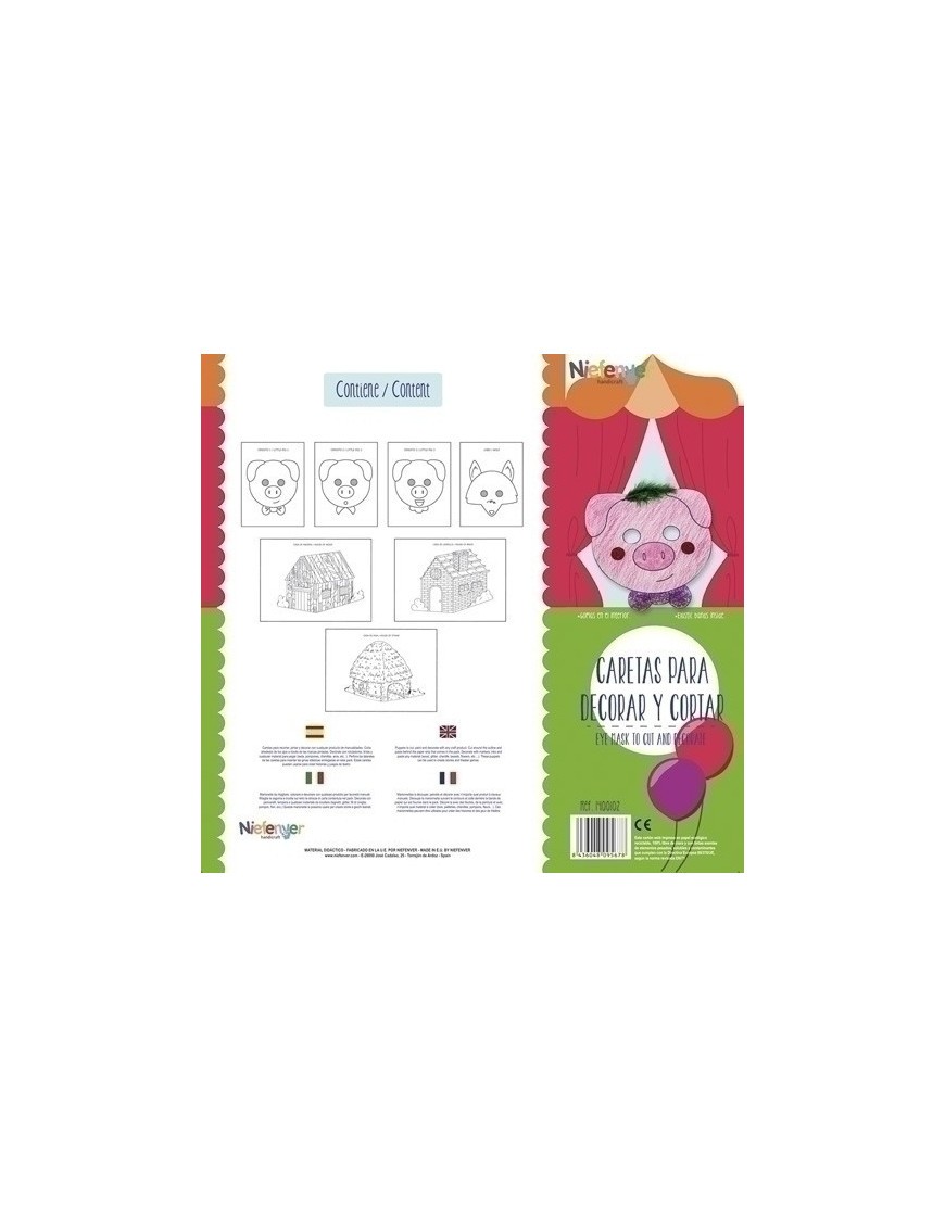 Pack de 4 caretas y 3 casitas en cartulina de 300 gramos con los personajes del cuento de los tres cerditos para pintar, recortar y decorar. Incluye goma elástica para finalizar nuestro trabajo y comencemos la representación.