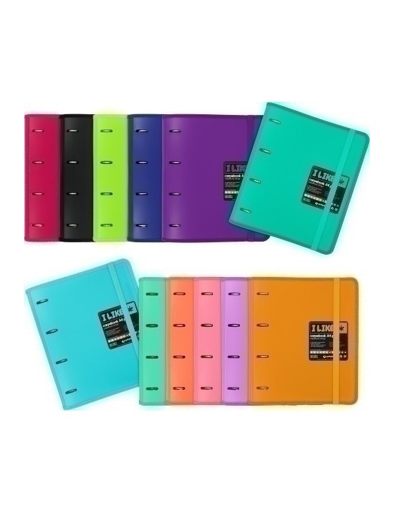 Carpeta con cubiertas en polipropileno semirrígido opaco, lomo curvo, mecanismo de 4 anillas mixtas de 35mm, 6 separadores extra gruesos de colores, sobre transparente con cierre de velcro y cierre mediante goma elástica de 15 mm de ancho, del mismo color que la carpeta. Incluye recambio de 100 hojas de 90g/m² microperforadas con borde de color, cuadrícula de 5 mm y certificado FSC®.