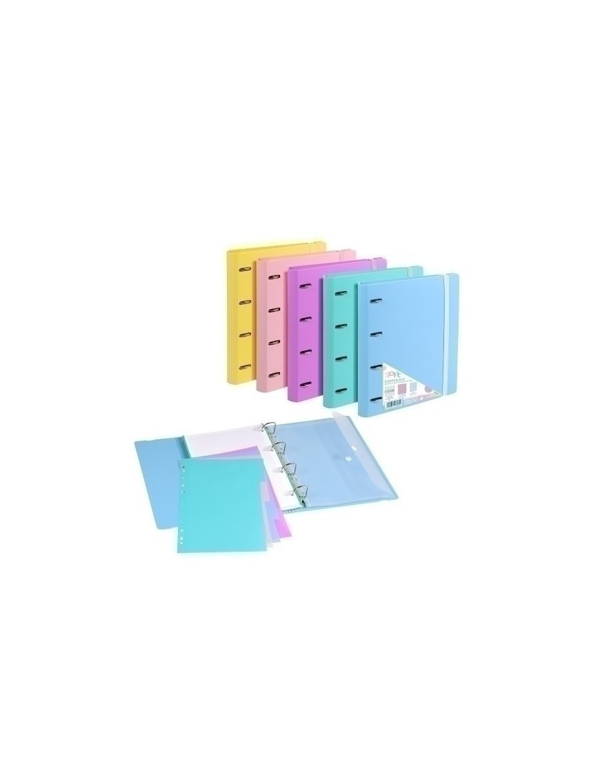 Carpeta en tamaño A4 con 4 anillas de 35 mm, cubiertas de polipropileno foam de 2 mm de grosor, sobre con solapa y cierre de velcro, cierre de goma, juego de 4 separadores de polipropileno extra fuerte y recambio de 100 hojas de 90 gramos con banda de color.