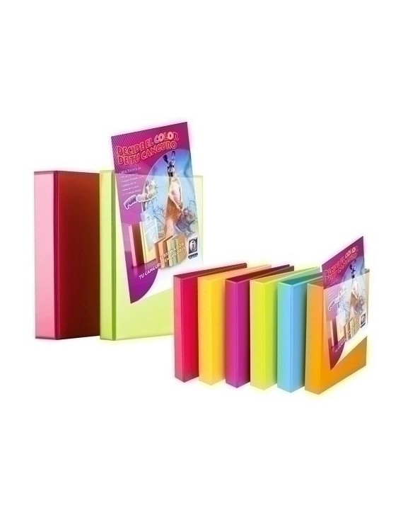 Ideal para la rápida confección de carpetas personalizadas. Fabricado en PVC de alta gama de atractivos colores, con bolsa cristal en frente y lomo con anillas mixtas.