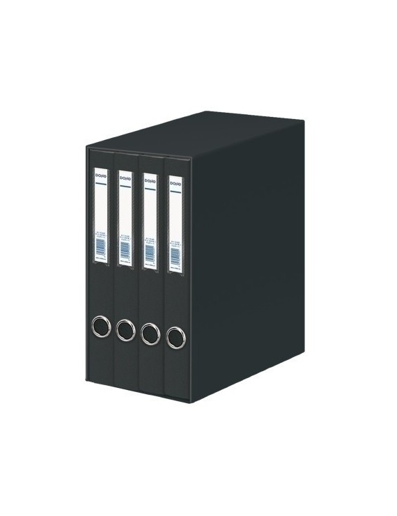Módulo fabricado en cartón reforzado acanalado; forrado con papel impreso exterior, en color. Cuatro carpetas de 2anillas de 25 mm para proteger las carpetas y su contenido. Certificado FSC Mixto. Medidas: 355 x 290 x 190 mm.