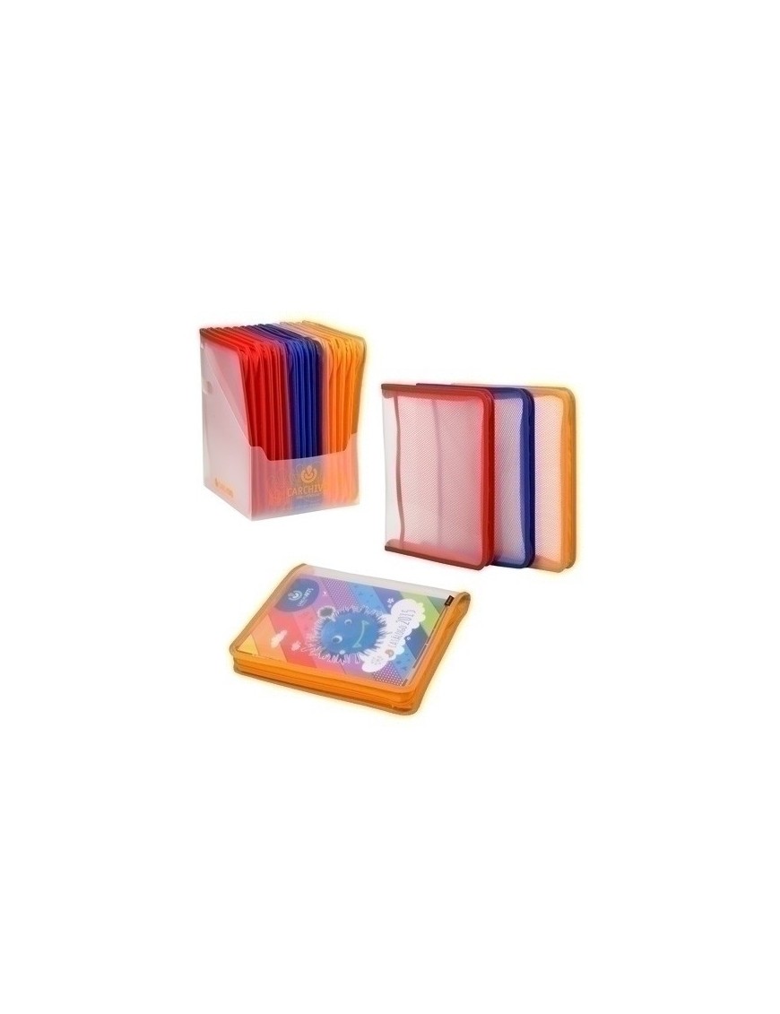 Cartera con cremallera fabricada en polipropileno diagonal transparente con ribete de tela y bolsillo interior de rejilla ribeteado en color: rojo, azul o naranja. Todo en un tamaño 345 x 265 x 40 mm.