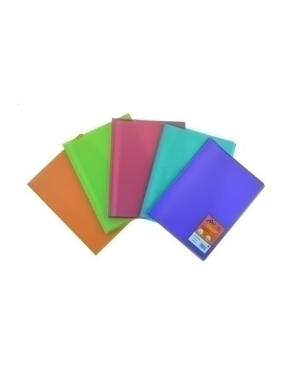 Cubiertas en polipropileno semi rígido translúcido de 500 micras. Tamaño A4 con fundas interiores de polipropileno, soldadas al lomo. 6 colores surtidos.