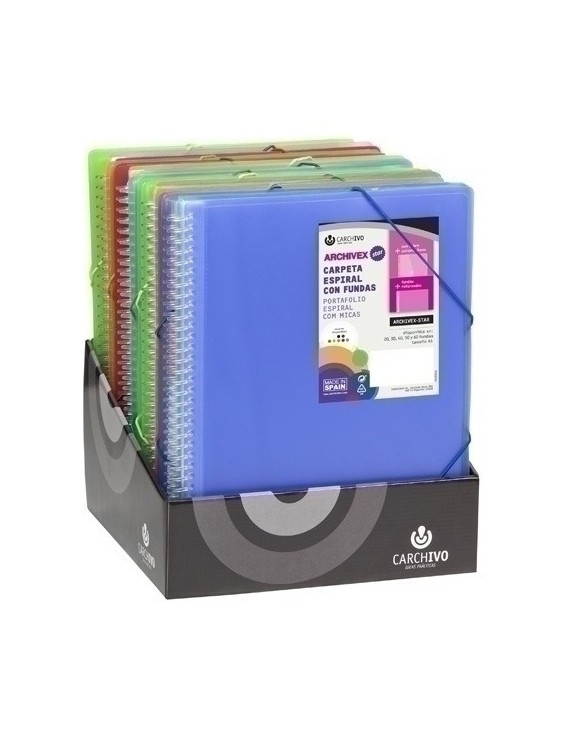 Carpetas con fundas de polipropileno con refuerzo (calidad extra), espiral, cierre con goma elástica y sobre de polipropileno con cierre de velcro y solapa en el interior. Unas carpetas en colores surtidos para tarifas, catálogos y otros documentos.