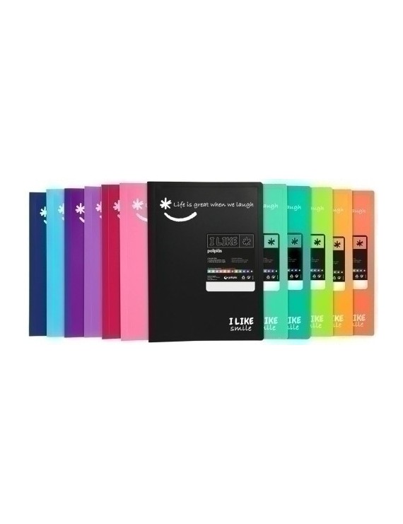 Carpeta con cubiertas en polipropileno semirrígido opaco, fundas transparentes de PP extra soldadas al lomo y grabado en portada en alto relieve I like.