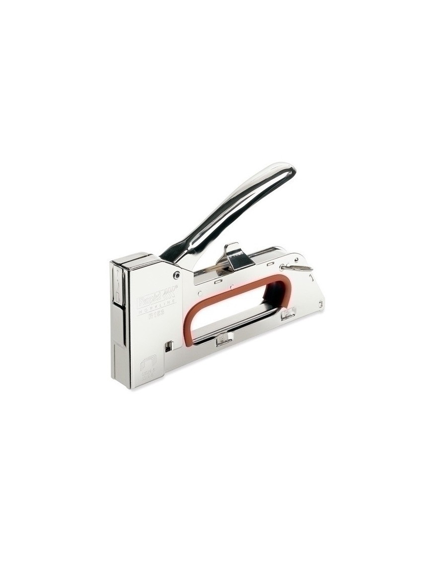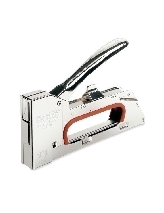 Clavadora en acero de alta duración exigencias de usuarios profesionales. apropiada para sujetar materiales delgados, como tela, papel y rótulos. Grapas 53/4-8 mm. Dimensiones 120x34x184 mm.