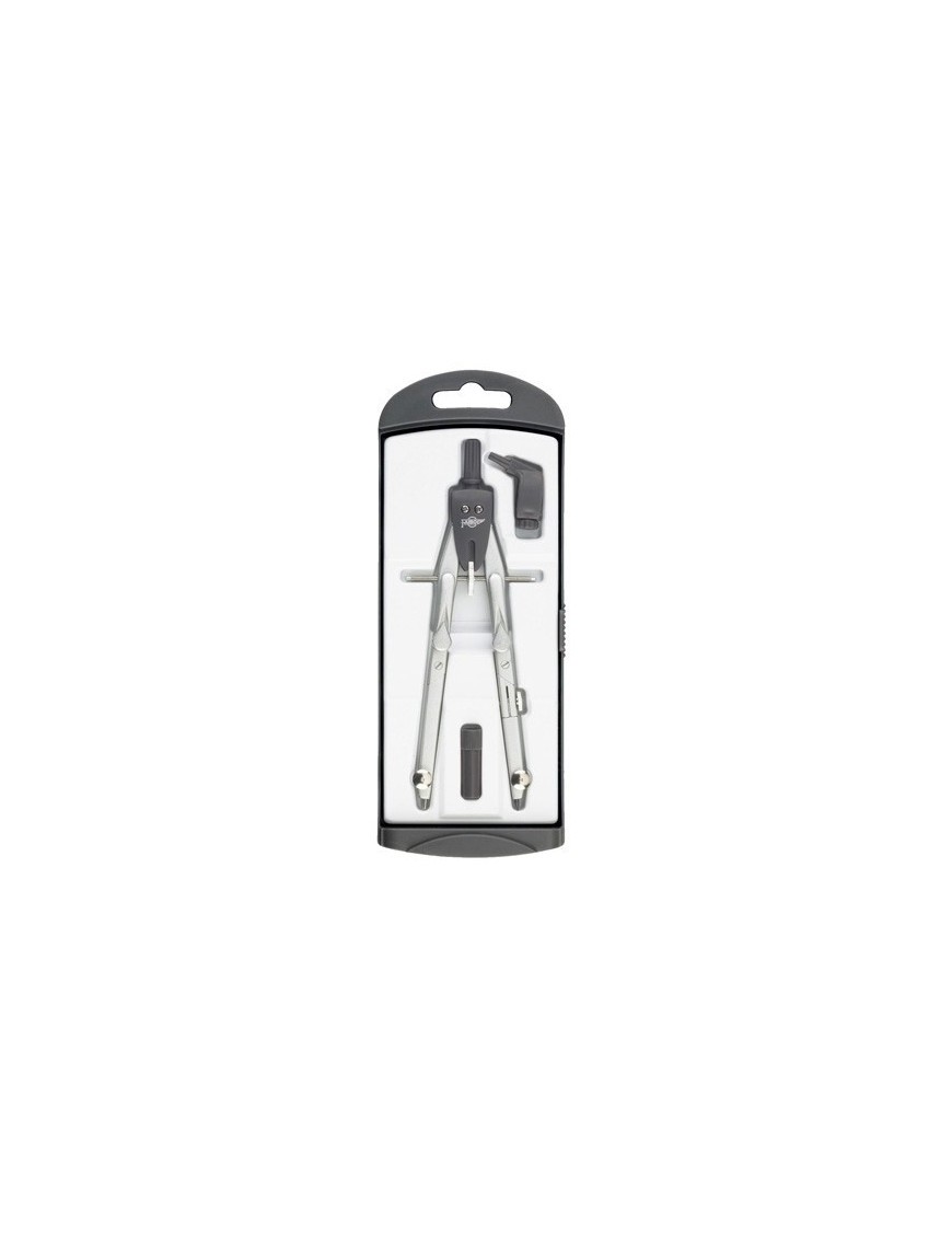 Compás micrométrico presentado en estuche de plástico. Incluye adaptador universal y caja de minas. De ajuste rápido. Ambos brazos articulados. Longitud del compás de 165 mm. Puede realizar circunferencias hasta 280 mm. 100% Reciclable. Certificados según norma EN 71.