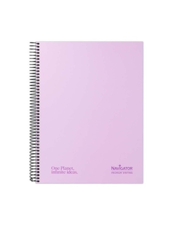 Cuaderno con espiral negra y cierre coil-lock; tapa extradura con tacto suave y acabado mate; guarda extragruesa negra impresas en plata; 80 hojas microperforadas con 4 taladros y banda de color a juego con la tapa, en papel de 80g/m² Premium Writing navigator; y rayado en azul con cabecera y logo Navigator. Todo en papel certificado FSC®.