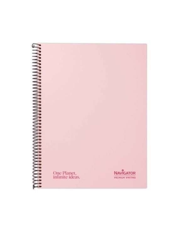 Cuaderno con espiral negra y cierre coil-lock; tapa extradura con tacto suave y acabado mate; guarda extragruesa negra impresa en plata; 120 hojas microperforadas con 4 taladros y 5 bandas de color a juego con la gama, en papel de 80g/m² Premium Writing navigator; y rayado cuadriculado en azul con cabecera y logo Navigator. Todo en papel certificado FSC®.