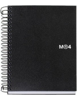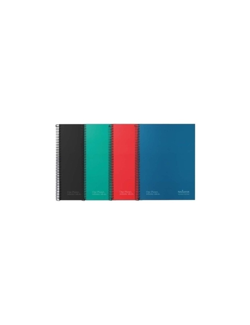 Cuaderno con espiral negra y cierre coil-lock; tapa extradura con tacto suave y acabado mate; guarda extragruesa negra impresa en plata; 120 hojas microperforadas con 4 taladros y 5 bandas de color a juego con la gama, en papel de 80g/m² Premium Writing navigator; y rayado en azul con cabecera y logo Navigator. Todo en papel certificado FSC®.