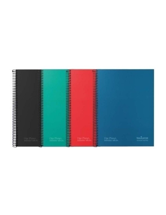 Cuaderno con espiral negra y cierre coil-lock; tapa extradura con tacto suave y acabado mate; guarda extragruesa negra impresa en plata; 120 hojas microperforadas con 4 taladros y 5 bandas de color a juego con la gama, en papel de 80g/m² Premium Writing navigator; y rayado cuadriculado en azul con cabecera y logo Navigator. Todo en papel certificado FSC®.