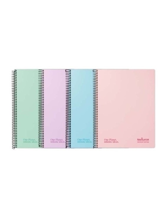 Cuaderno con espiral negra y cierre coil-lock; tapa dura contracolada con tacto suave y acabado mate; guarda extragruesa negra impresa en plata; 80 hojas en papel de 80g/m² Premium Writing navigator; y rayado cuadriculado en azul con cabecera y logo Navigator. Todo en papel certificado FSC®.