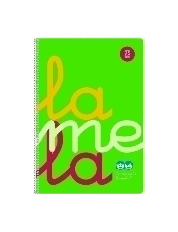 Cubierta de polipropileno flúor, espiral sencilla con lazo vuelto, lacado en blanco y un interior de 80 hojas, en papel offset blanco extra de 90 gramos, rayados con CUADROVÍA en tamaño folio y margen. Disponible en distintos colores.