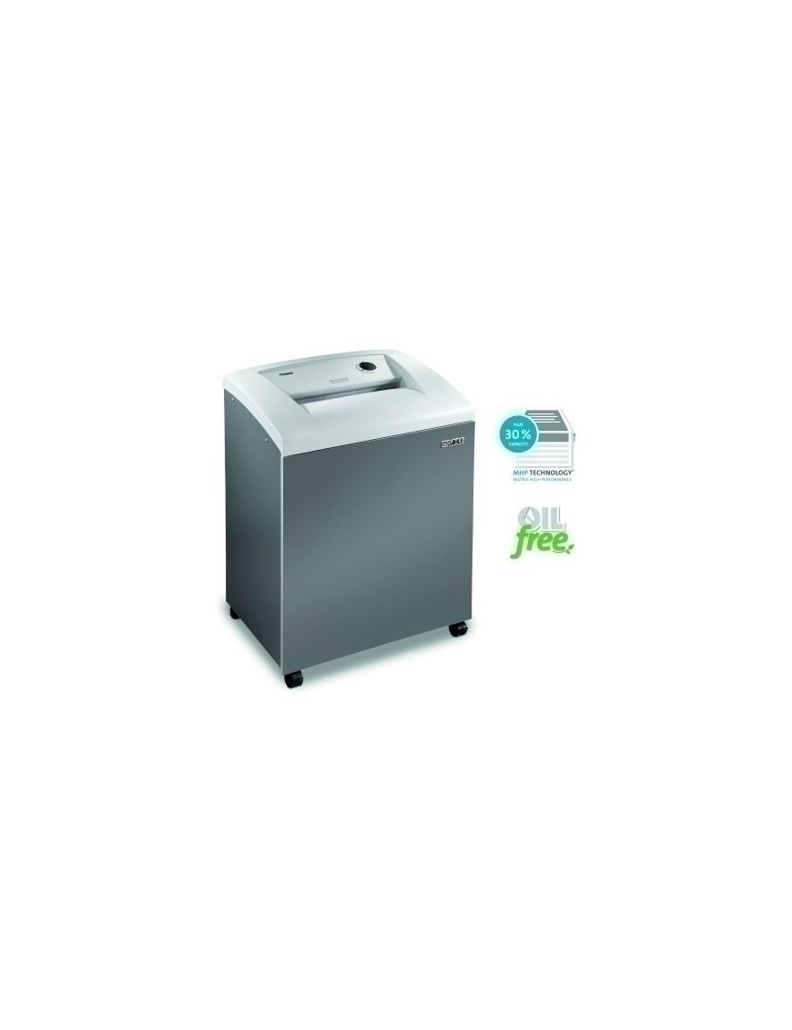 Destructora de documentos para grandes volúmenes con rodillo de corte MHP, para mayor durabilidad, potencia y comodidad. Funcionamiento silencioso (52db), sin lubricación ni mantenimiento; nivel de seguridad P-4/F-1/O-3/T-4/E-3; corte en partículas (4 x 40 mm);destruye de 18 a 20 hojas de 80 gramos, CD/DVD, tarjetas y clips; tiene apagado automático a los 30 minutos de inactividad; funciones luminosas; señales acústicas; parada automática cuando la bolsa está llena; función de retroceso y avance; ranura y depósito recolector de CD independiente; puertas de amplia apertura, para un rápido vaciado; potente motor, para un gran rendimiento; cuatro ruedas con freno; interruptor principal independiente; práctico conector IEC; capacidad: 3.700 hojas y potencia 900W. Medidas: 960 x 734 x 511 mm.