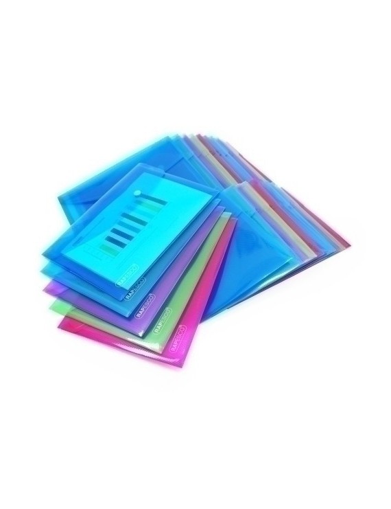 Dosier sobre broche de polipropileno de colores brillantes y translúcidas, con capacidad para guardar hasta 75 hojas de 80 g/m² en A5. Ideal guardar papeles sueltos o para ordenar los documentos para una presentación. Incluye broche y soporte para bolígrafo bajo la solapa.