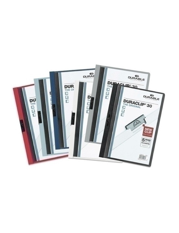 La carpeta DURACLIP® 30 está fabricada en PVC con pinza de acero especial, tiene una capacidad para 30 hojas en tamaño A4, su portada es transparente y lleva color en el lomo y en la contraportada. Todo ello la hace ideal en presentaciones, archivo, conferencias, seminarios e informes.