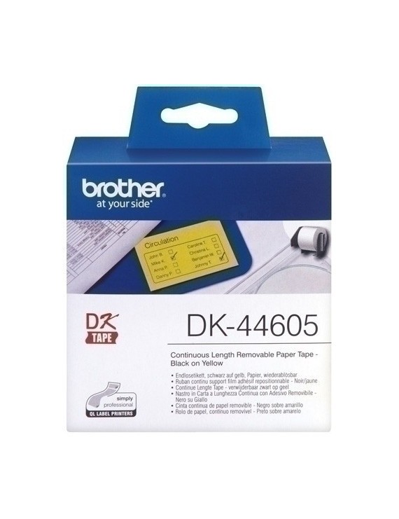 Cinta continua amarilla de papel térmico removible para identificaciones temporales que no dejan restos adhesivos. Una solución en color en la que puedes incorporar de forma rápida y sencilla: imágenes, logotipos, códigos de barras, fechas o cualquier otra información.