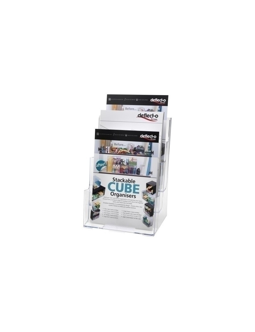 Portafolletos de sobremesa con tres compartimentos escalonados para mostrar folletos en formato DINA4 vertical. Está fabricado en poliestireno de gran calidad y alto brillo, en unas medidas de 245 x 322 x 160 mm. Un portafolletos que nos da opción de colocarlo en la pared.
