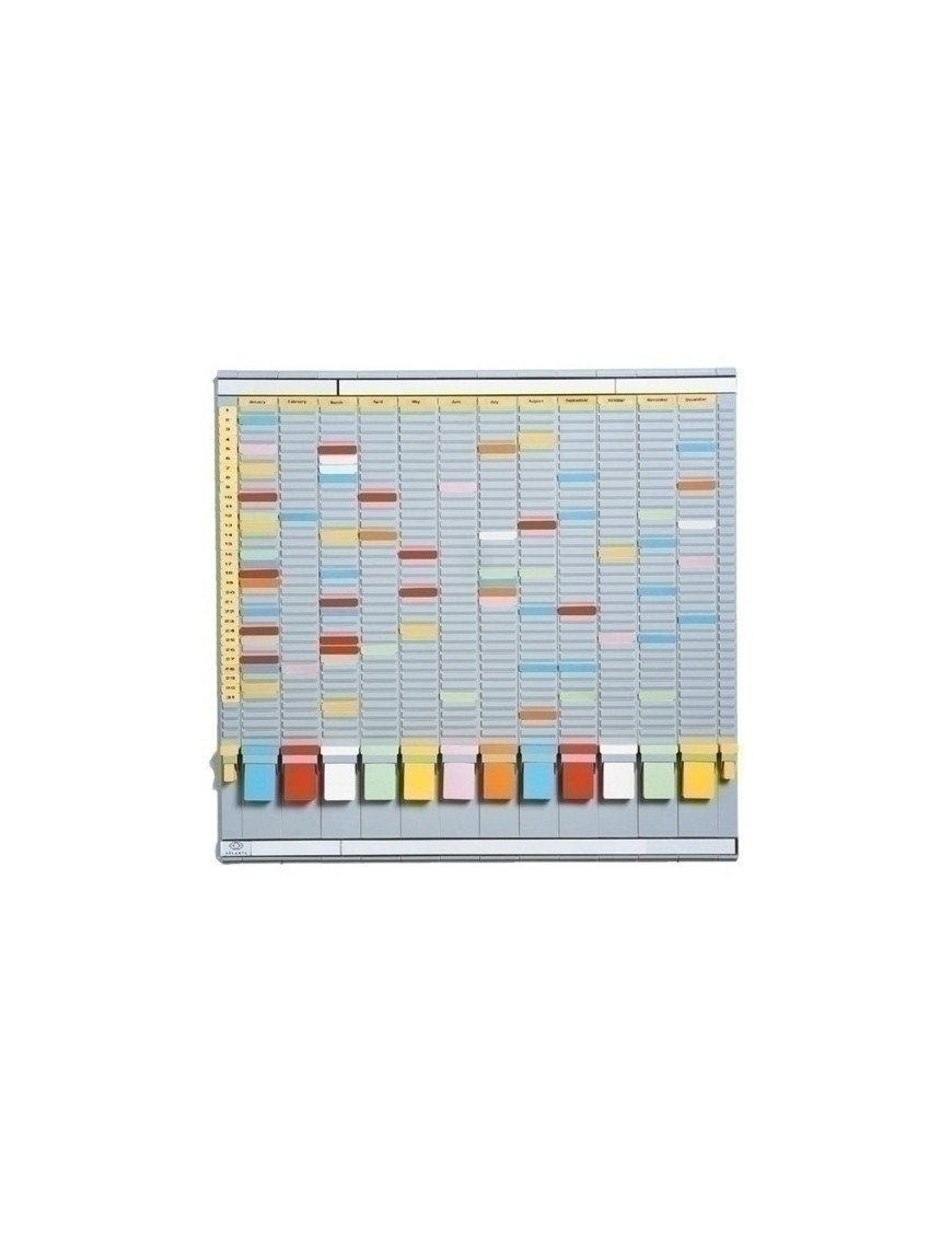 Juego de planificación anual completo con T-cards en formato 2 (48 mm). Contiene:12 elementos de pizarra de planificación con 35 ranuras; 2 elementos de pizarra de planificación en formato 1 (15 mm) con 35 ranuras; 2 pares de perfiles de conexión (630 mm y 189 mm), 7 tarjeteros y 14 paquetes de T-cards en colores: blanco, rosa, rojo, naranja, amarillo, verde y azul. Incluye: tornillos, tacos e instrucciones de montaje.