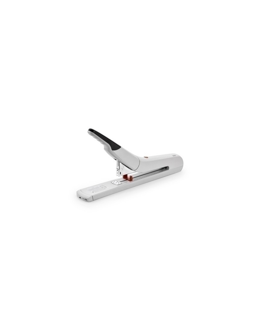 Grapadora metálica recubierta de plástico con sistema antibloqueo (ABS), para evitar atascos; cargador de apertura frontal con doble guía; sufridera rotativa para grapados cerrados, en paralelo y bypass; y profundidad de entrada del papel hasta 250 mm. Una grapadora con una capacidad para 170 hojas de 80 g/m². Utiliza grapas tipo 23/8 a 23/20 súper.