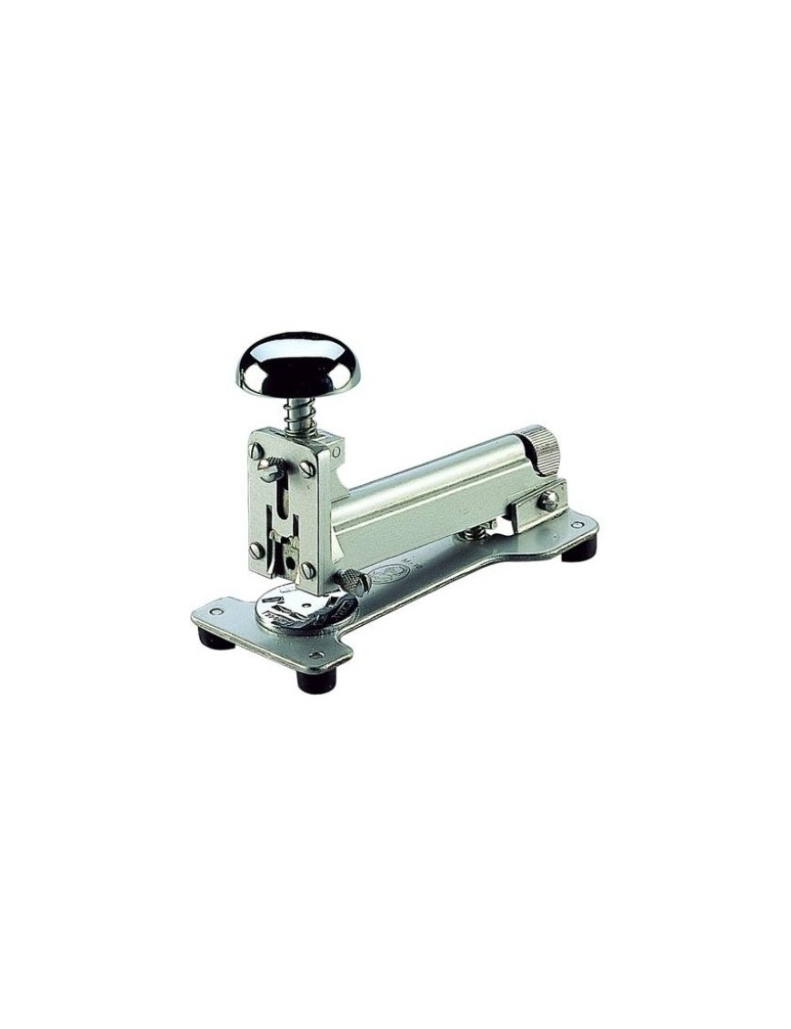Grapadora de sobremesa de pulsador fabricada en acero y zamak con baño de cobre níquel y cromo brillante, acabada en lacado gris; tiene una profundidad de entrada de papel de 80 mm, una capacidad de carga de hasta 100 grapas del número 22/6 y 24/6 y una capacidad de grapado de hasta 25 hojas (medidas de 132 x 57 x 95 mm)