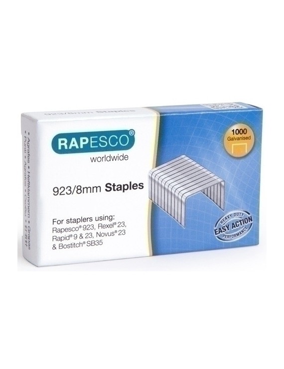 Grapas galvanizadas de calidad superior compatibles con grapadoras tipo 923, Swingline de alta resistencia, Rapid tipo 9, Rexel tipo 23, Rexel tipo 66, Novus tipo 23, 5 Star y Q-Connect. Caja con 1000 grapas de 8 mm de longitud.