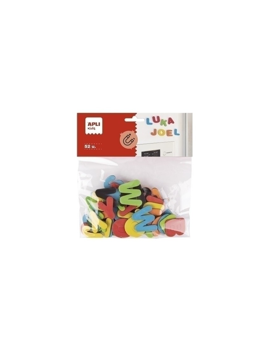 Imanes de goma EVA en forma de letras en colores surtidos. Medida de los imanes de 30 x 30 mm. Cada bolsa contiene 52 letras mayúsculas de la A a la Z en colores: amarillo, naranja, rojo, azul y verde. Ideales para utilizar en manualidades. Excelente herramienta para que los más pequeños empiecen a familiarizarse con el abecedario (material suave y seguro).