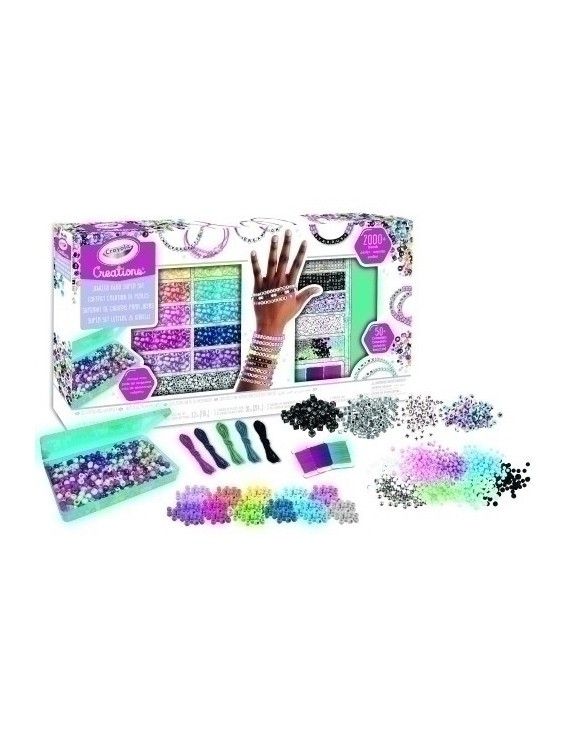Súper kit de cuentas para hacer joyas y accesorios personales. Más de 2000 cuentas para confeccionar más de 50 pulseras. Un juego aparentemente sencillo para todas las edades, que consiste en ensartar las cuentas en la goma elástica; una actividad que refuerza la psicomotricidad infantil, desarrolla su creatividad y despierta su interés por la artesanía. Contiene: 64 gramos de cuentas con letras, 150 gramos de perlas surtidas, 5 colores de gomas elásticas (azul, negro, rosa, verde y violeta), 3 cuerdas (rosa, turquesa y violeta) y 1 maletín de almacenaje.