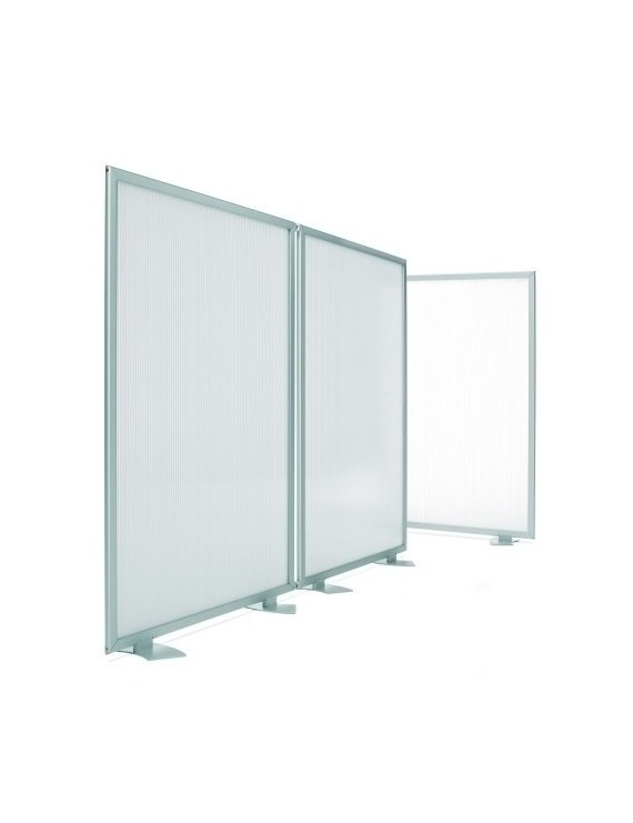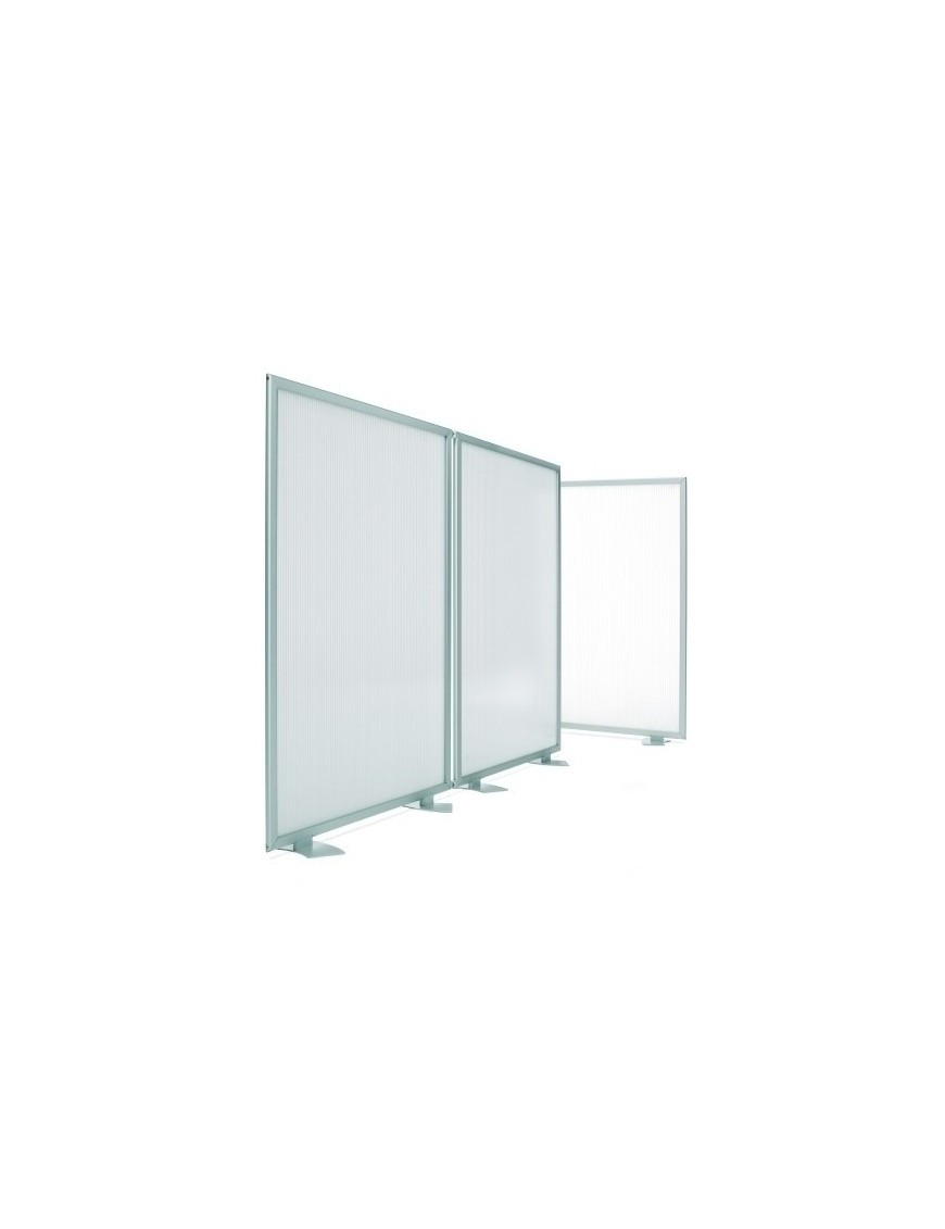 Mamparas policarbonato acanalado translúcido, fabricada con perfil perimetral de aluminio anodizado plata mate. Para su cuidado: limpiar con paño seco y un detergente neutro, limpiacristales.