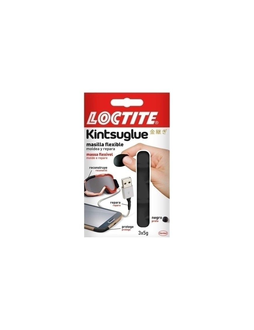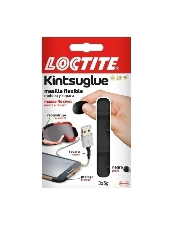 Loctite Kintsuglue es una masilla que ha sido creada para reparar, reconstruir, proteger y mejorar casi todos los materiales, incluso los más flexibles. Es un producto fácil de moldear y se adapta a la forma de cualquier objeto, por lo que es ideal para: proteger cables, reconstruir gafas, etc. Se puede reposicionar durante 30 minutos. Contiene 3 tiras de 5 gramos.