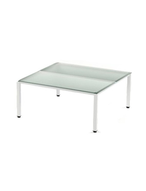 Estructura realizada en tubo de acero de 40x30mm de sección fijados entre ellos y a los 4 pies mediante 4 pletinas de aluminio fundido. Los pies son de tubo de acero de 60x60mm de sección e incorporan sistema de regulación de altura hasta 50mm. Todo ello pintado en epoxy blanco RAL9010. El tablero es cristal templado translúcido de 10mm de grosor.