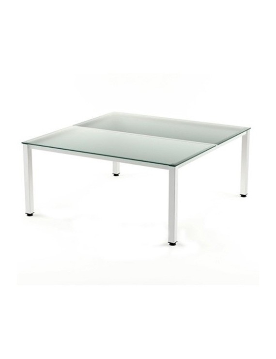 Estructura realizada en tubo de acero de 40x30mm de sección fijados entre ellos y a los 4 pies mediante 4 pletinas de aluminio fundido. Los pies son de tubo de acero de 60x60mm de sección e incorporan sistema de regulación de altura hasta 50mm. Todo ello pintado en epoxy blanco RAL9010. El tablero es cristal templado translúcido de 10mm de grosor.
