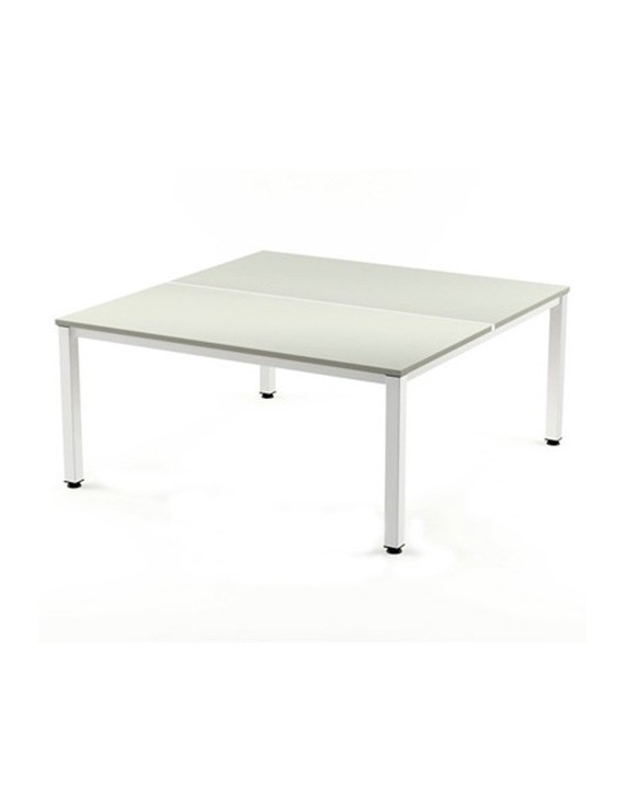Estructura realizada en tubo de acero de 40x30mm de sección fijados entre ellos y a los 4 pies mediante 4 pletinas de aluminio fundido. Los pies son de tubo de acero de 60x60mm de sección e incorporan sistema de regulación de altura hasta 50mm. Todo ello pintado en epoxy blanco RAL9010. El tablero es