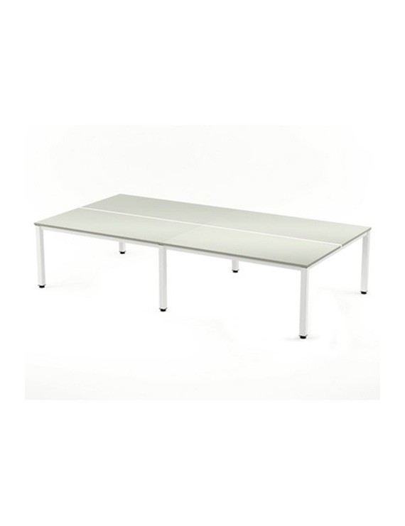 Estructura realizada en tubo de acero de 40x30mm de sección fijados entre ellos y a los 4 pies mediante 4 pletinas de aluminio fundido. Los pies son de tubo de acero de 60x60mm de sección e incorporan sistema de regulación de altura hasta 50mm. Todo ello pintado en epoxy blanco RAL9010. El tablero es de melamina de 25mm de grosor color según modelo canteado en PVC de 2mm del mismo color.