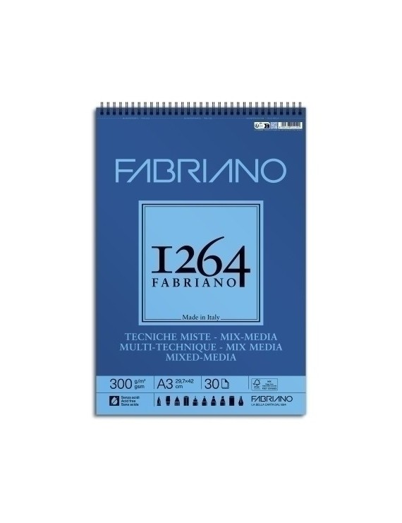 Bloc espiral para técnicas mixtas con 30 hojas de papel liso de 300 gramos. Recomendado para esbozos, dibujos con lápices de color, pluma, acuarela, témpera y más. Libre de ácidos; con certificado FSC®; larga vida ISO 9706; producido con al menos un 60% de energía hidroeléctrica; celulosa utilizada para fabricar el papel se ha blanqueado sin hacer uso de biósido de cloro.